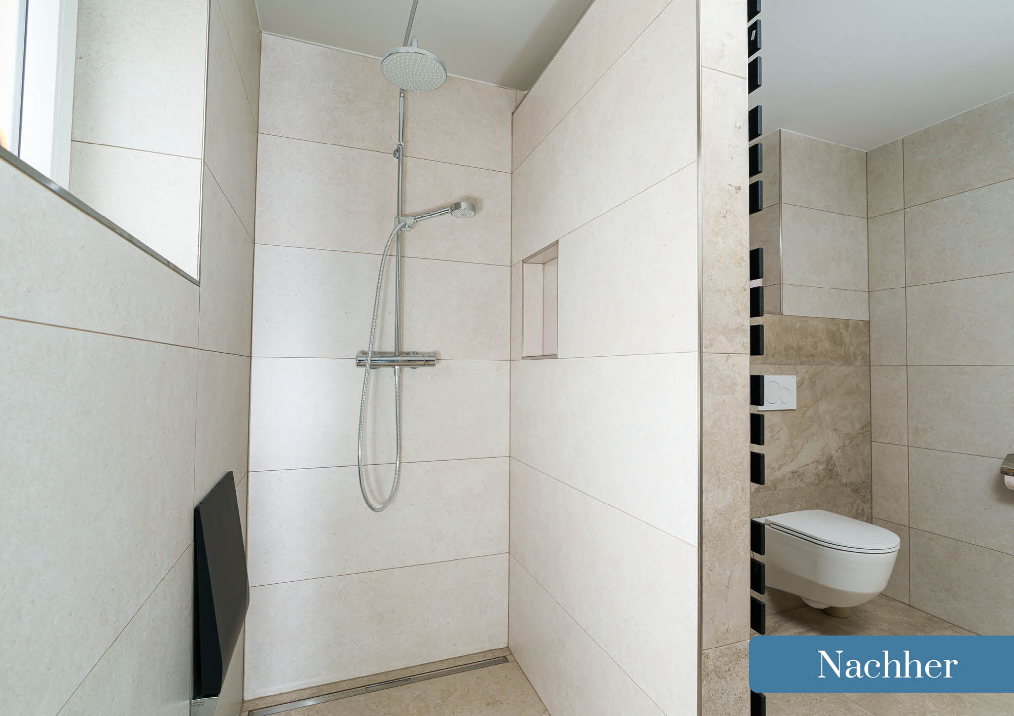 Durch die neue Platzierung der Badewanne, gewinnt dieses modernisierte Bad an Geräumigkeit und Freiraum. Statt des hohen Einstiegs in die alte Dusche, entsteht eine neue Walk-In-Dusche, welche durch ihre offene Gestaltung sofort auf ein entspanntes Duscherleben einlädt!