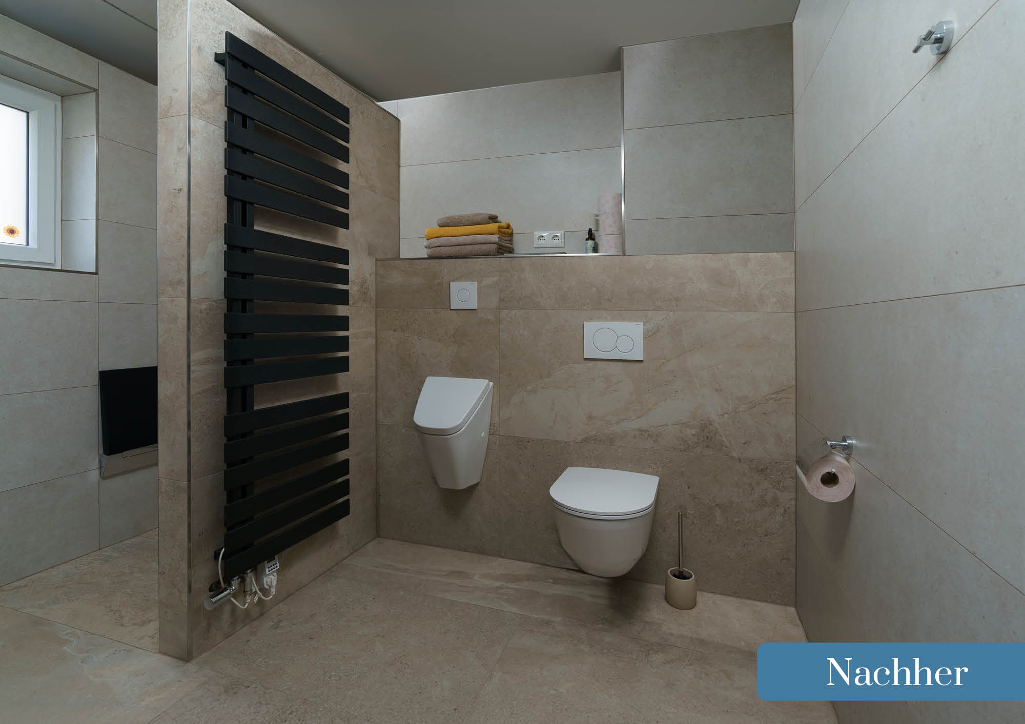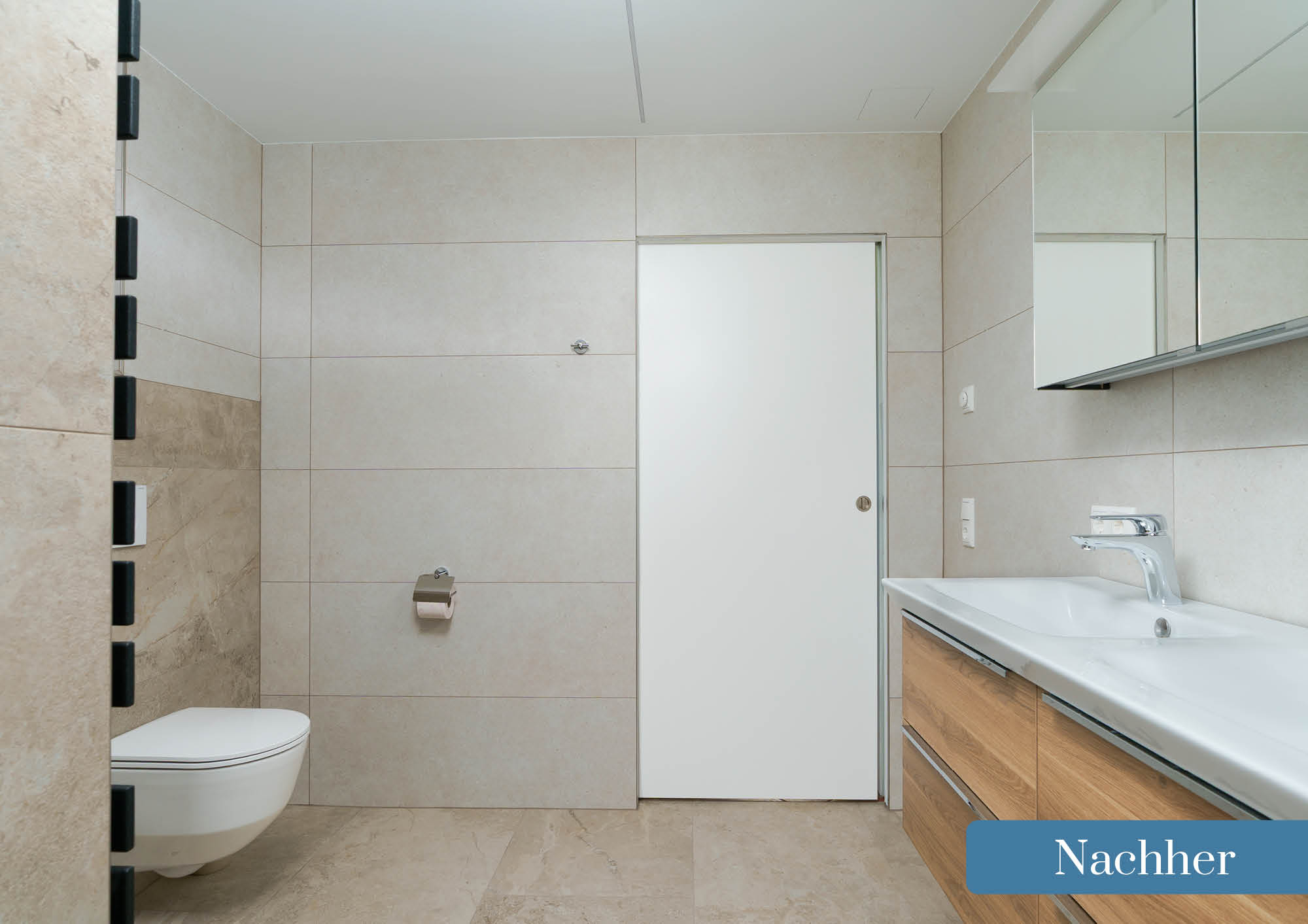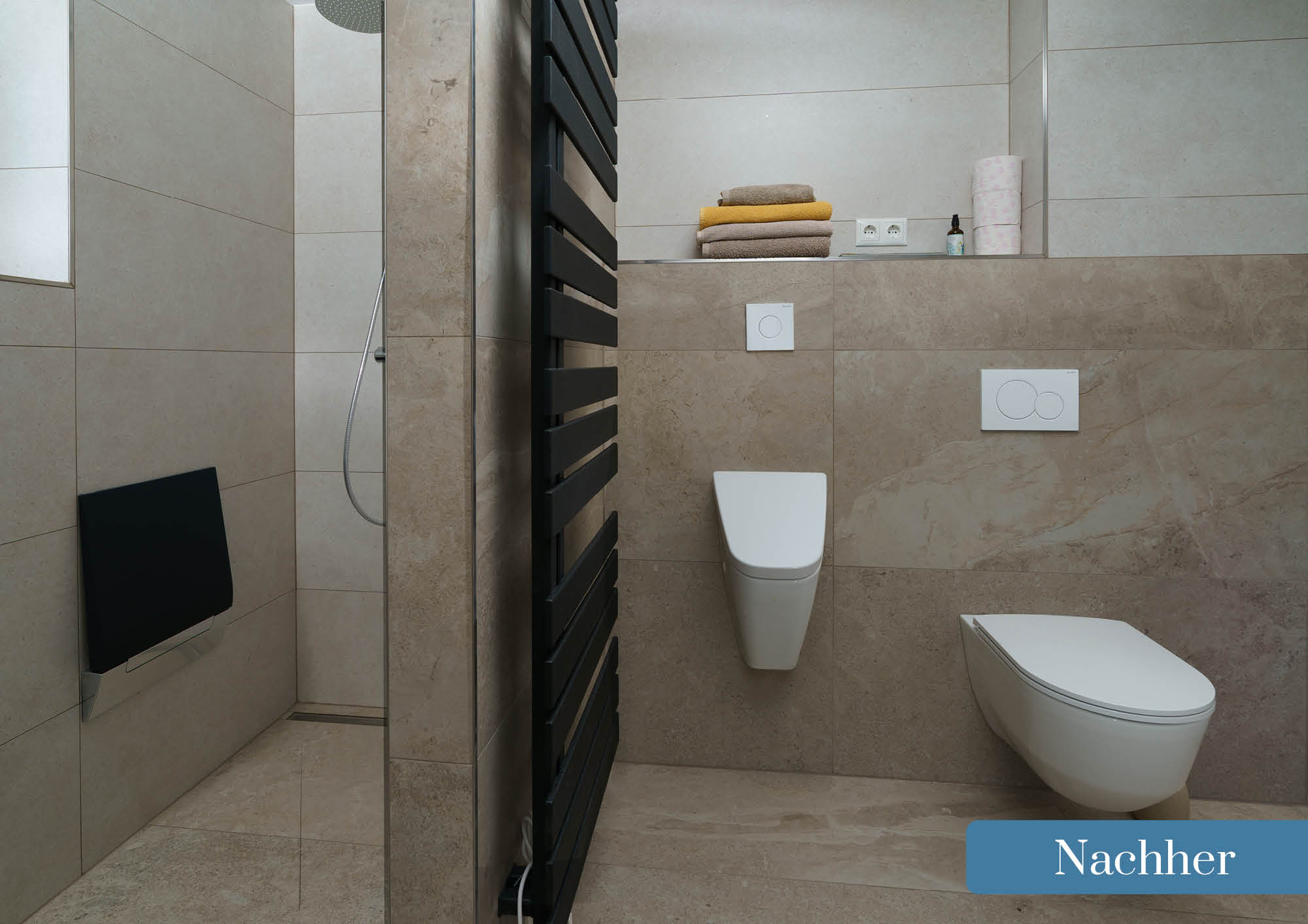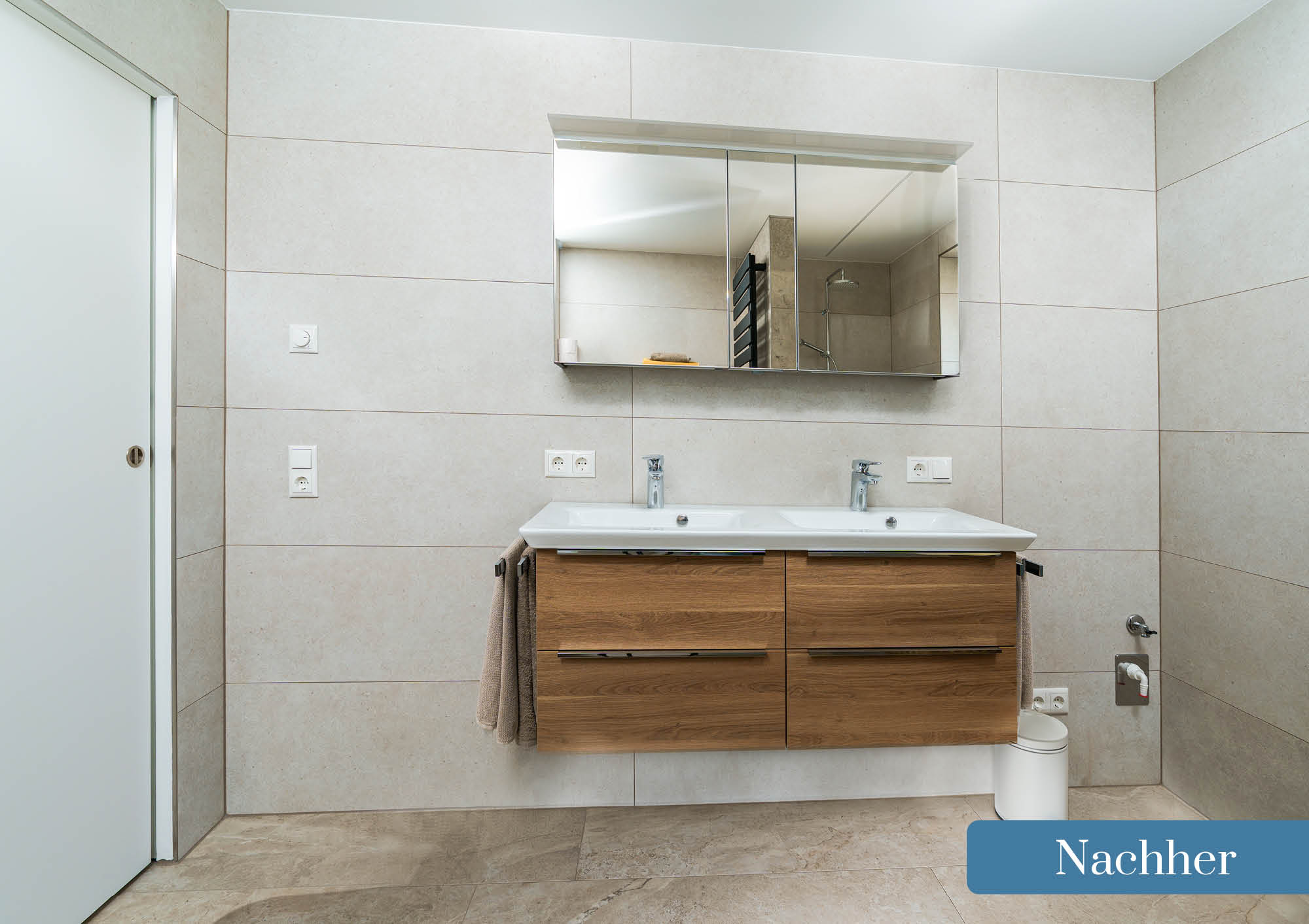Besonders eindrucksvoll sind die offene, barrierefreie Dusche sowie der neue Doppelwaschtisch, die nicht nur praktisch, sondern auch optisch ein echtes Highlight sind. Durch helle Farben und hochwertige Materialien wirkt der Raum nun freundlich, zeitlos und einladend.
