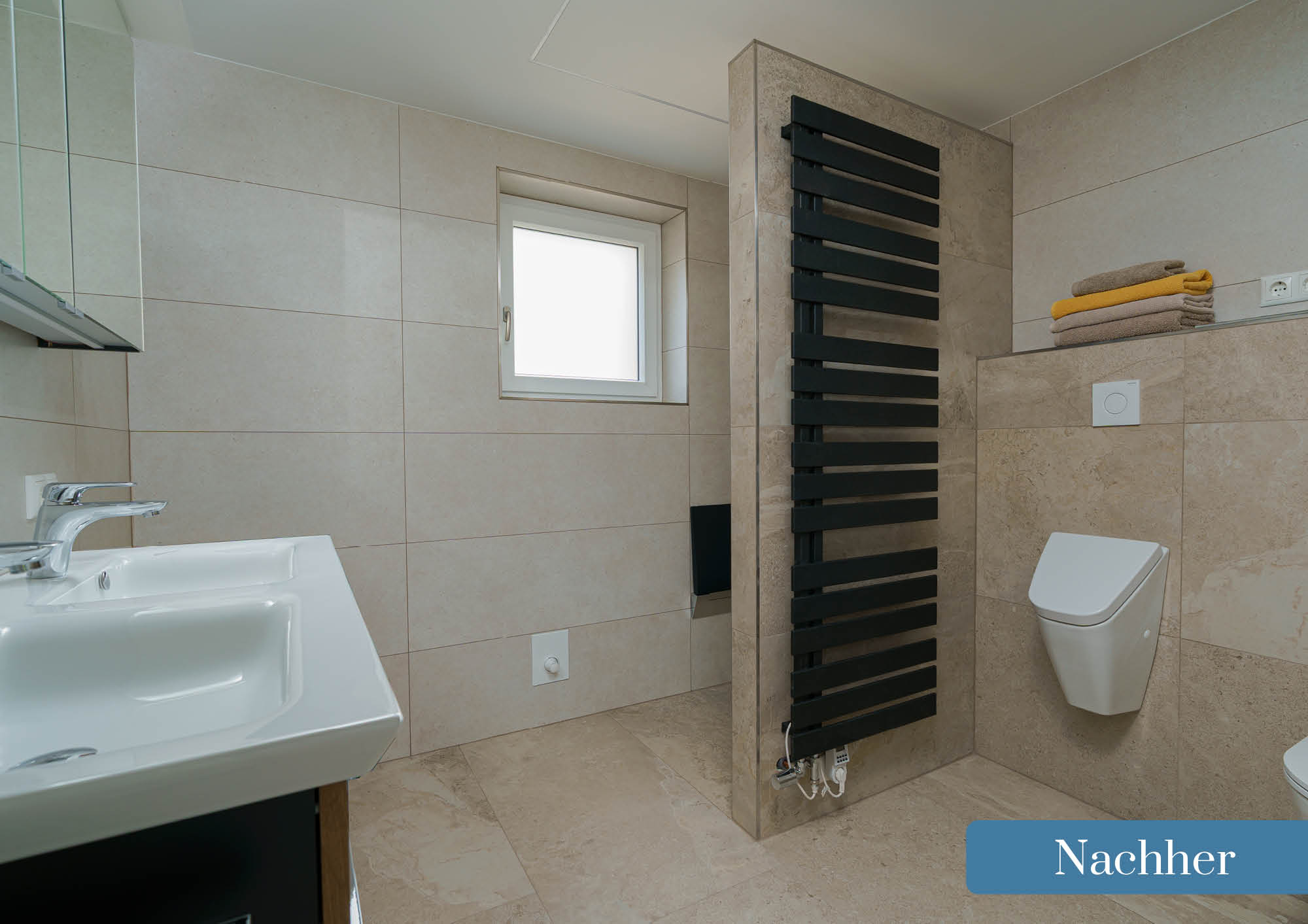 Neues Badzimmer, neues Wohlfühlparadies! Die modernen Fliesen und die stilvolle barrierefreie Regendusche verwandeln diesen Raum in eine kleine Wellness-Oase. Auch die Naturtöne des Waschtisches und der Kästen bilden ein stimmiges Gesamtbild.
