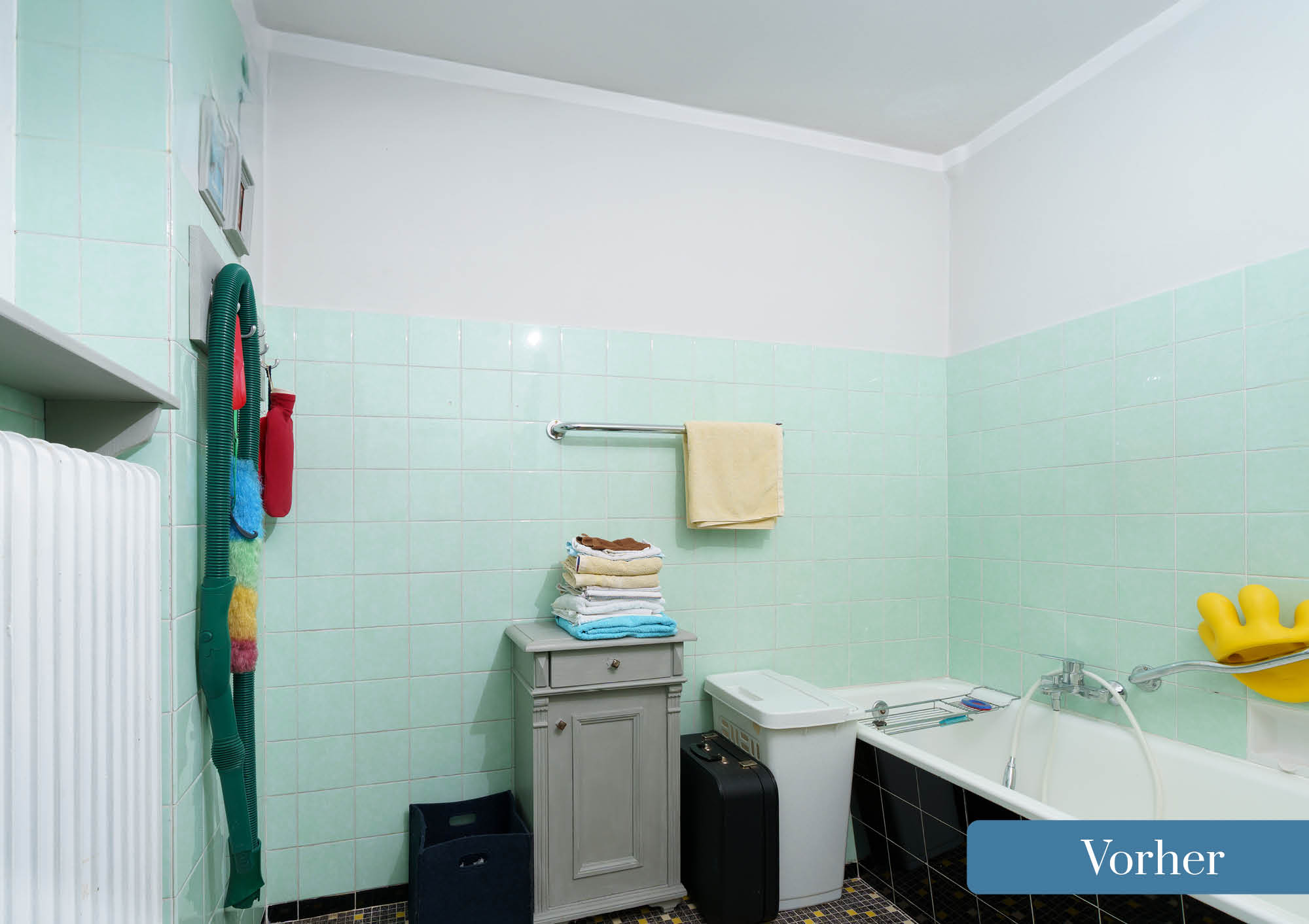 Aus diesem alten Bad, mit erhöhtem Podest für Badewanne und Dusche, wurde ein zeitgemäßes Bad gezaubert. Durch die Neuanordnung der Sanitärelemente wird zusätzlicher Stauraum geschaffen.