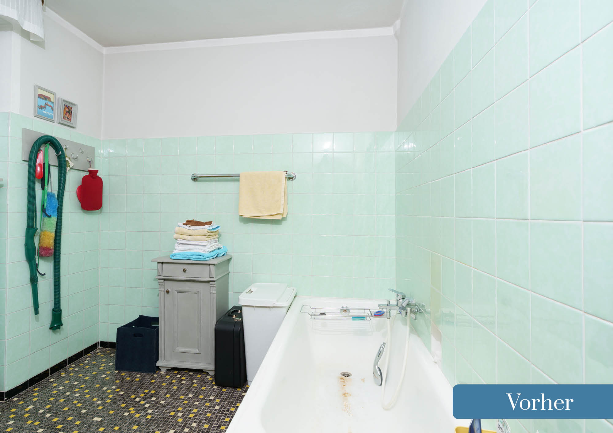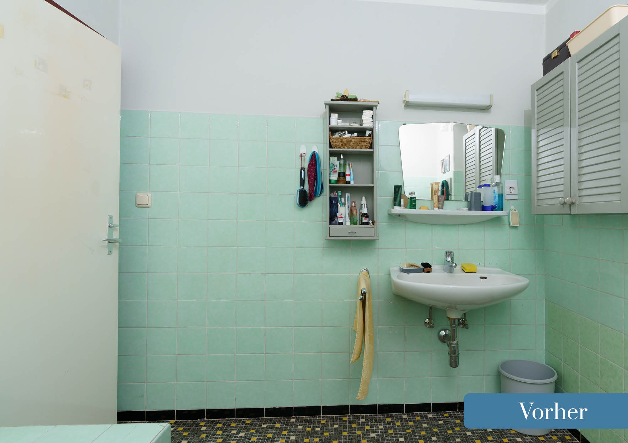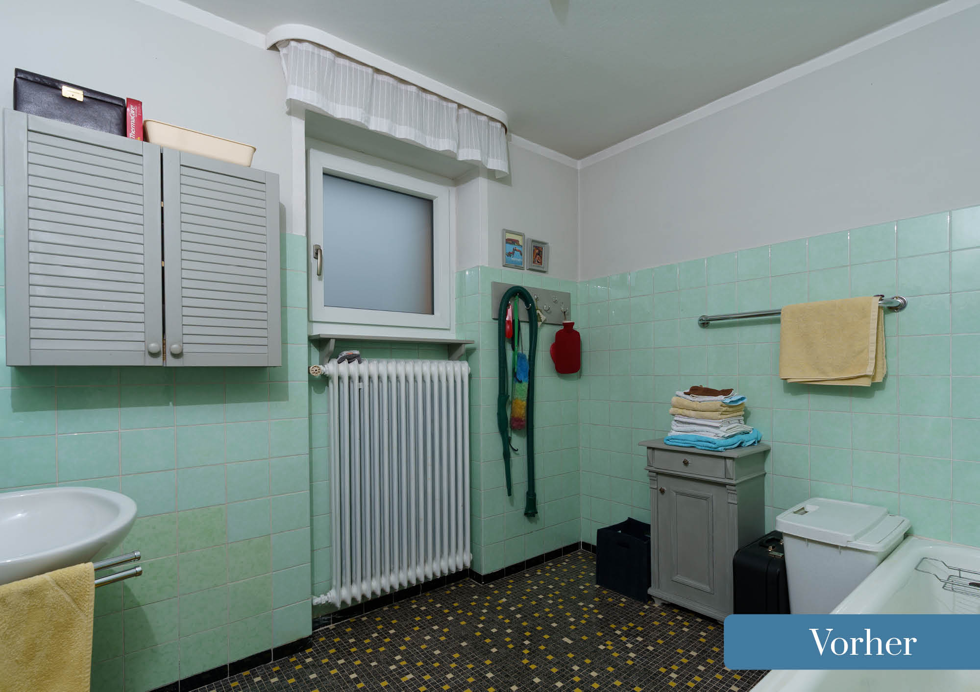 Aus diesem alten blauen Badezimmer haben unsere Profis ein modernes, zeitloses Bad gezaubert.